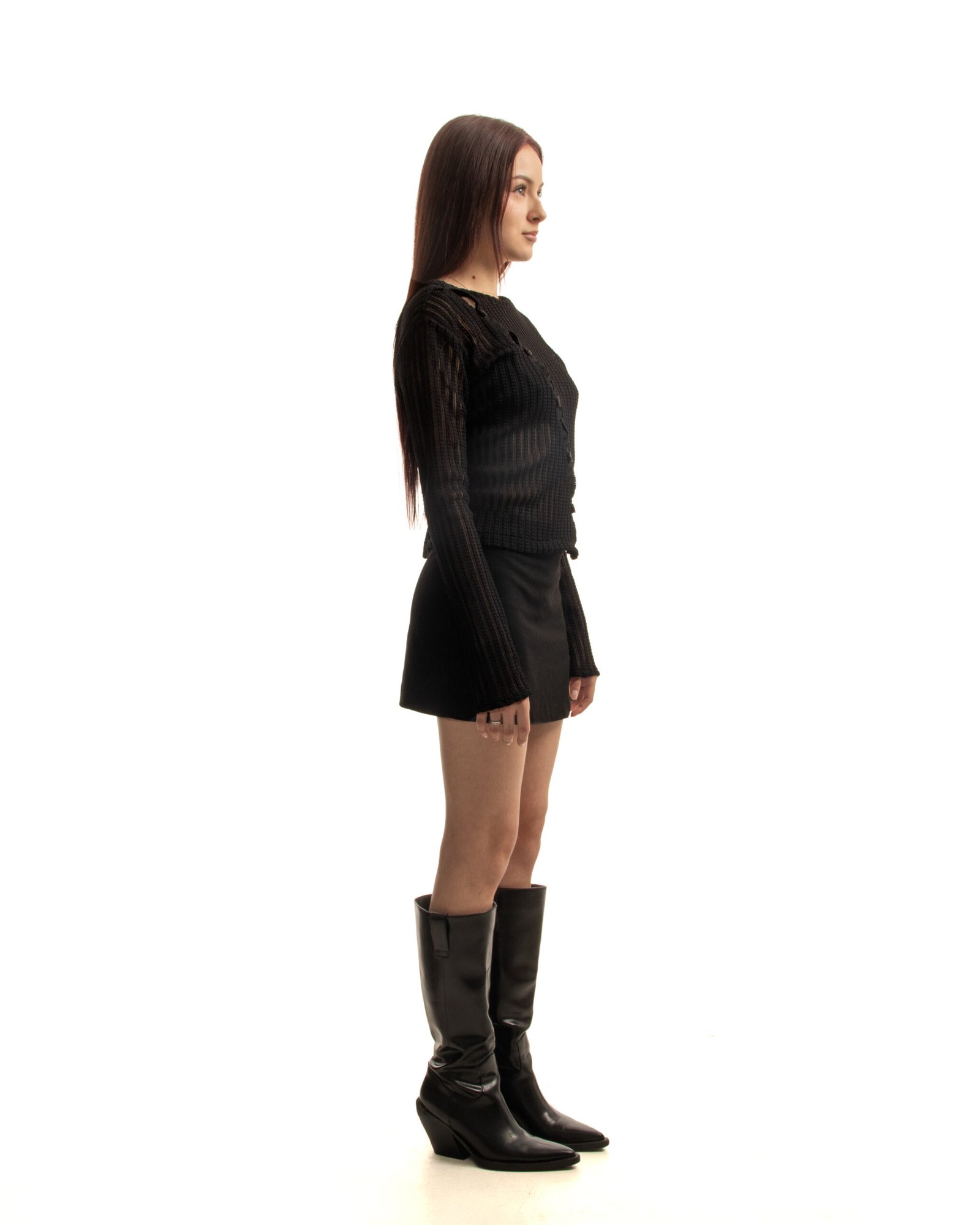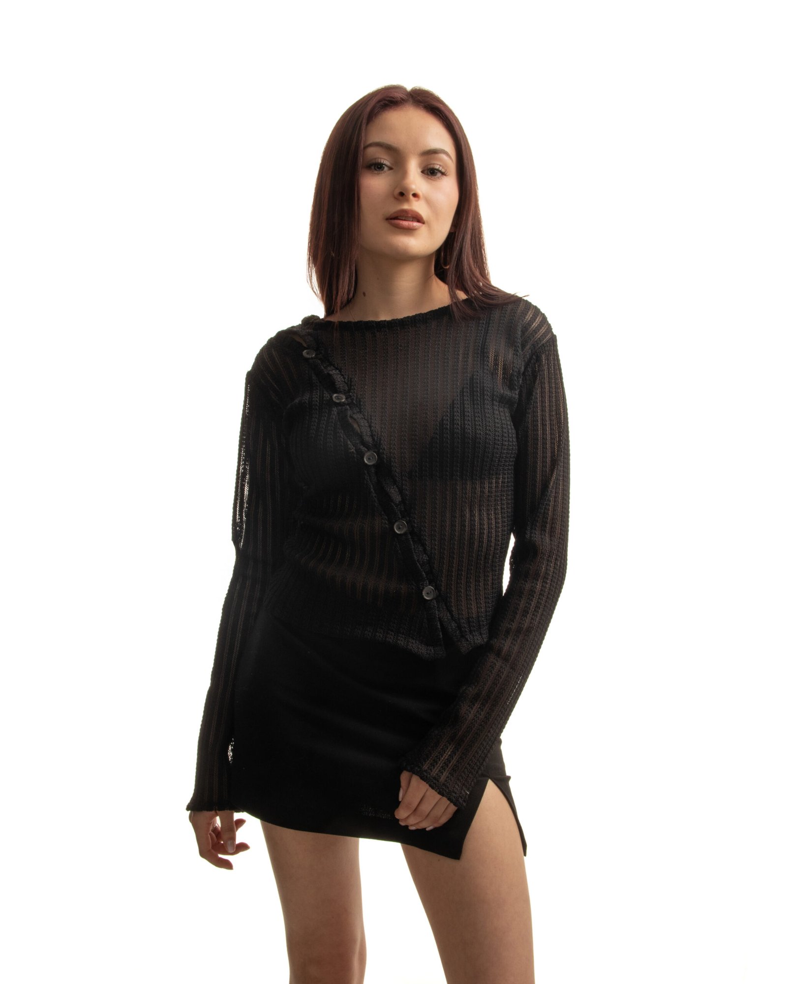 Top Nocturne. Cárdigan manga larga diseñado con botones frontales asimétricos, una pieza en tendencia perfecta para elevar tus looks.